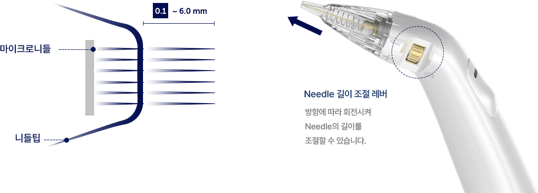 최소 0.1 mm에서 최대 4 mm 깊이까지 0.1 mm 단위로 바늘 깊이 조절